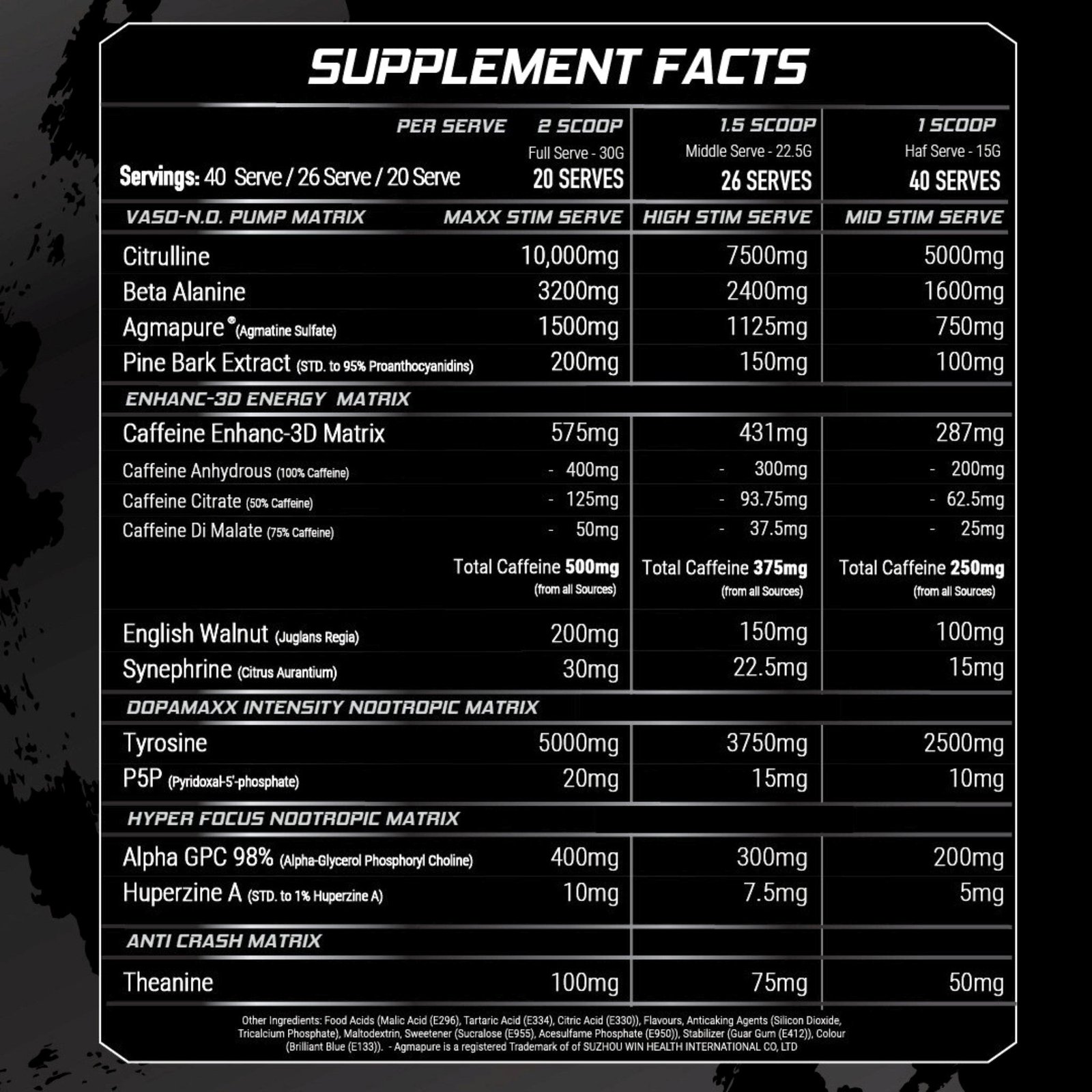 Altered State V3 is one of the most insanely dosed formulas on the market, delivering clinical-dose performance with a multi-serve system to customise your stim level (MID, HIGH + MAXX). A full MAXX Serve contains: