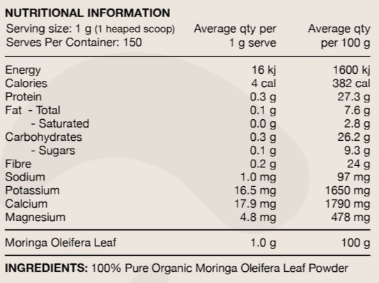 Known as the “Miracle Tree,” Moringa is one of the most nutrient-dense plants on Earth. Our 100% pure, organic moringa leaf powder delivers a rich source of natural protein, fibre, vitamins, minerals, and powerful antioxidants including quercetin, chlorogenic acid, and niazirin.