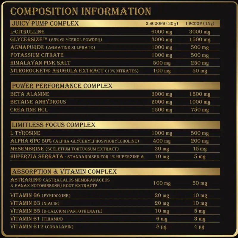 Transparent Supps Pump Juice gives athletes GARGANTUAN blood flow and vascularity thanks to its pump complex. Increased power output thanks to its power performance complex and dialed laser-like focus from the limitless focus complex. Get an ABSURD pump with a full double scoop containing: